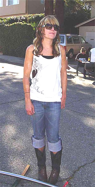 Jessica decided to shoot a short scene from this film to use as a marketing tool, an intro, and just to see how her vision looked on film. I was very fortunate that I, Bonnie Steiger, was cast to play, not the main character, but the nosy, gossipy, narrow minded woman who did most of the talking in that scene. That my character wears a shirt with a picture of Jesus and the phase "Who's the boss," is no accident. That my husband and I are color coordinated is also deliberate. |